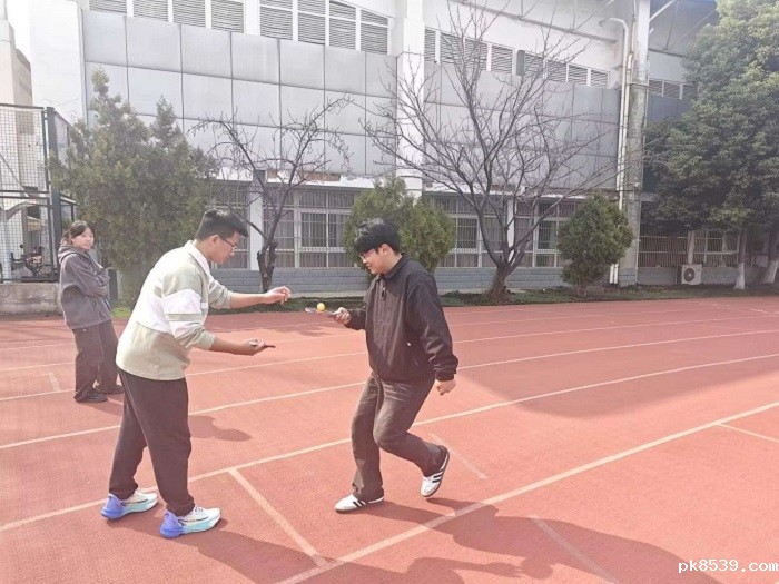 “动感活力”的趣味运动会以“团结、协作、快乐”为主题,设置“乒乓球接力”“两人三足”“萝卜蹲”以及“拔河”等创意项目。“两人三足”环节,学生们两两搭档、默契配合,以整齐步伐向终点冲刺;“萝卜蹲”游戏中,此起彼伏的欢笑声与偶尔的“乌龙”口令,将现场气氛推向高潮;“拔河”环节中,同学们紧紧握住绳子,身体后仰,齐心协力地往后拉,充分展现了团队的力量。参与学生在运动中释放学业压力,更通过团队协作加深了同窗情谊。