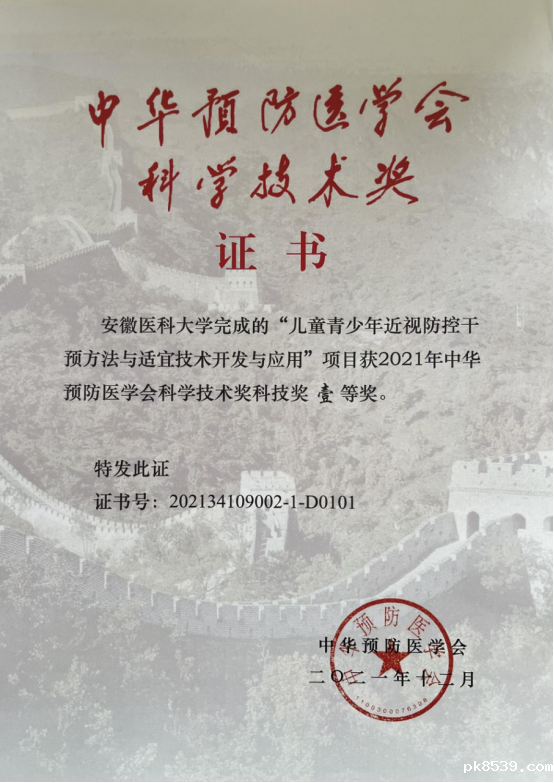 4月15日,由中华预防医学会、中国疾病预防控制中心主办的2023年全国疫苗与健康大会在杭州举行。来自世界卫生组织、国家卫生健康委、各级疾病预防控制和医疗卫生机构、科研院所、高等院校、各省预防医学会的领导、专家学者和专业人员5000多人齐聚一堂。大会开幕式举行了2021年中华预防医学会科学技术奖颁奖典礼。中心主任陶芳标教授团队完成的“儿童青少年近视防控干预方法与适宜技术开发与应用”项目获2021年中华预防医学会科学技术奖科技奖壹等奖。