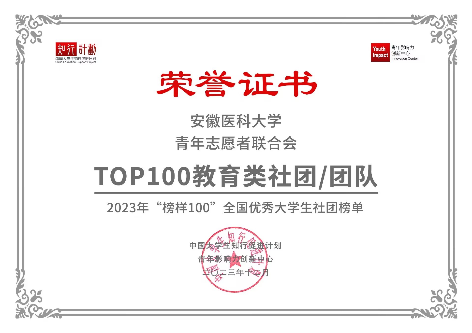 近日,中国大学生知行促进计划榜样100全国优秀大学生社团年度榜单正式发布,我校青年志愿者联合会荣获“全国优秀大学生社团TOP100教育类社团”,校大学生交叉医学研究社荣获“全国优秀大学生社团TOP100学术类社团”,我校基础医学院教师杜忆南获评“2023年度知行计划优秀青年导师”。
