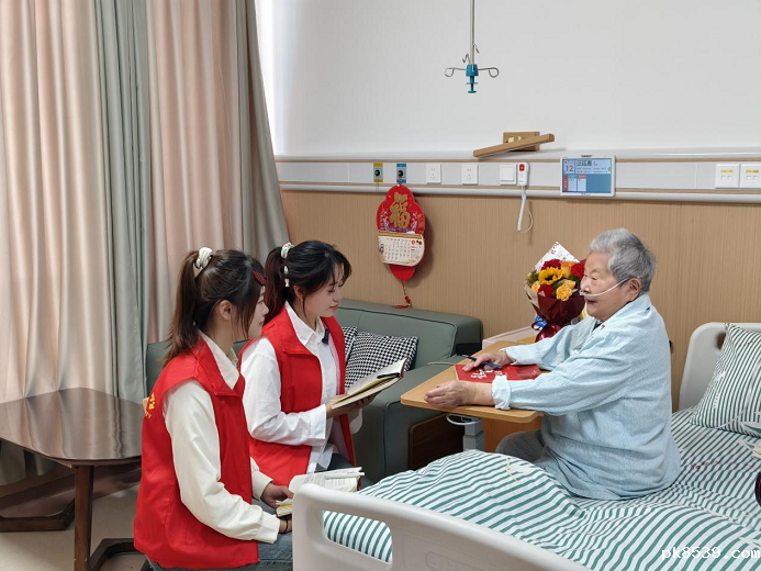 在合肥市第一人民医院(滨湖院区)医养结合病区,学院师生拍摄红色微党课,采访了四位平均年龄近百岁的老党员。94岁的汪奶奶曾从事党的宣传工作,回忆抗战岁月时她感慨:“年轻人要铭记历史,自立自强!”104岁的汪爷爷是渡江战役亲历者,他叮嘱学生:“入党是为人民服务,不是谋私利。”一对九旬党员夫妻的默契互动更令人动容——听力衰退的爷爷在奶奶“翻译”下分享革命故事。