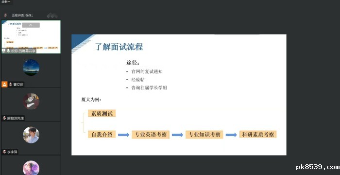 该院还邀请了考取研究生的优秀毕业生作了线上经验交流。学长学姐们从面试流程、面试礼仪和准备工作等方面,分享了各自经验,给出了自己复试的小技巧。